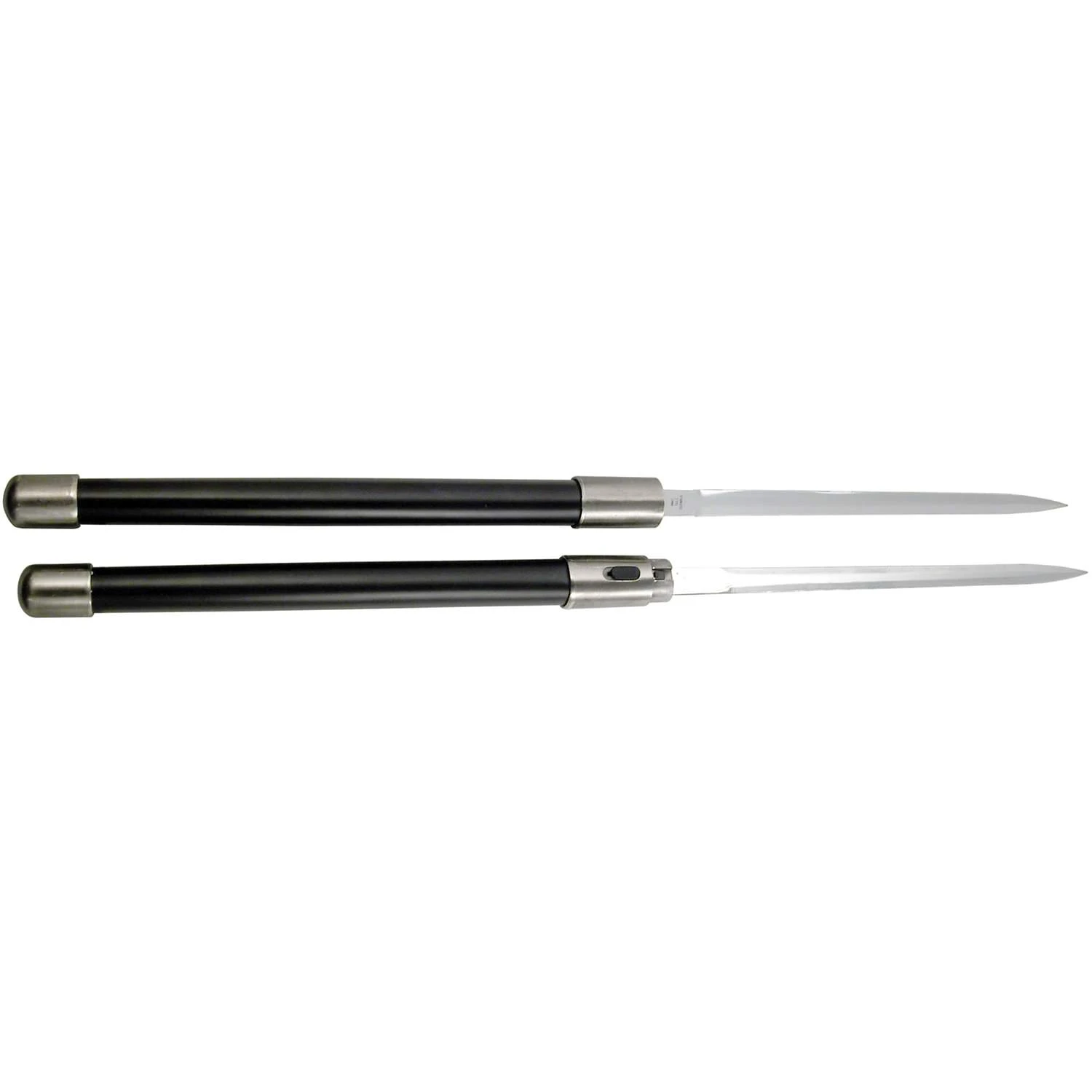 - Black metal handles also serve as sheath