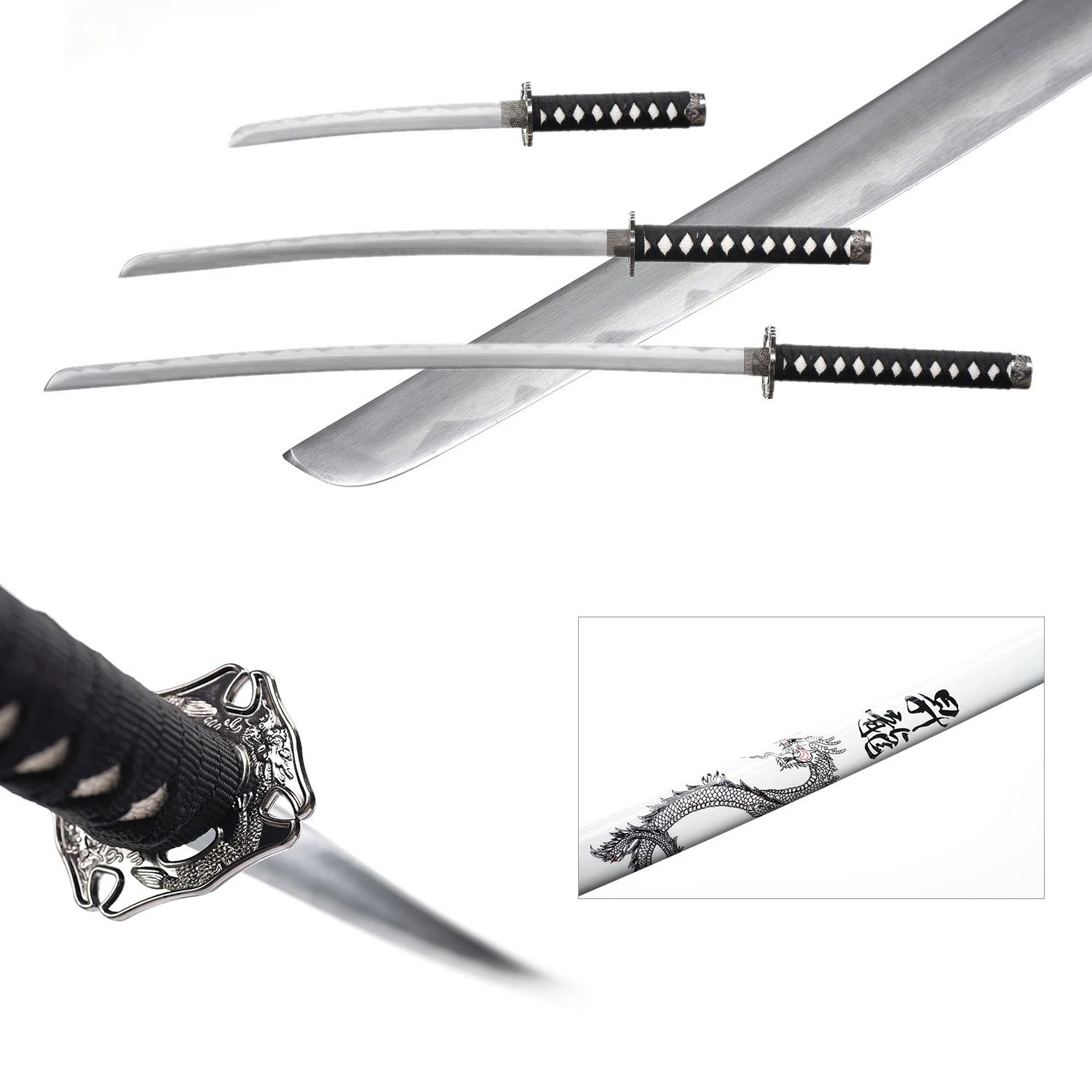 The white katana is characterized by its distinctive appearance: a curved, single-edged blade with a squared guard and long grip to accommodate two hands. The handles are wrapped which gives it a good grip to hold. The blade of sword is made up of high-quality carbon steel, therefore, enough in most of the cases to be used for cutting purposes efficiently (but not always recommended).Â