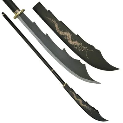 63 1/4″ overall. Fantasy Naginata with black traditional war blade.