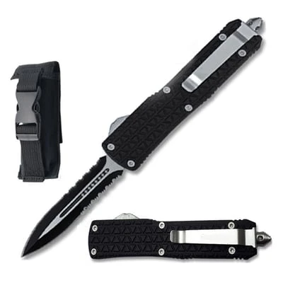 This Delta Force OTF knife features a two tone, black and satin finish stainless steel spear point serrated blade. The dual action allows you to use a slider trigger located on the side of the handle to propel the blade forward as well as retract. Talk about easy access! The handle itself is made from durable zinc alloy and has a diamond pattern finish for a firm hold even in the toughest weather conditions. A steel pocket clip and handy emergency glass breaker are featured on the handle. Overall Length 8.5 inches with Handle Length of 5.25 inches. Includes FREE Nylon Pouch with Belt Loop.