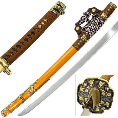 Japanese Tachi Ceremonial Katana Hardened Samurai Sword Functional. Overall Length With Scabbard: 40.75″ Featuring a through hardened 1045 carbon steel blade that is through hardened with an aesthetic hamon.