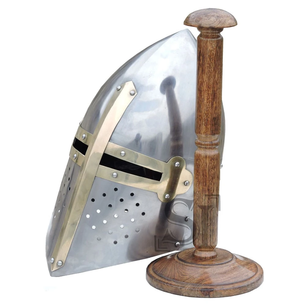 Sugarloaf helmet is variation of top helm with sphero-conical dome. It was popular in Europe in the first part of XIV century. This helm is made from 16g steel with real brass accents. The lower portion of the helmet consists of two parts that are riveted to the dome. The brass accents form a cross that attaches to the front with eye slits. The front features several holes for ventilation. Inside a leather suspension liner is provided for comfort and includes an adjustable chin strap with steel buckle. A steel loop is also provided to hold the extra leather tight from the adjustable chin strap. The sugarloaf helmet is easy-to-use and provides with perfect protection during medieval fencing. Comes with the wooden display stand.