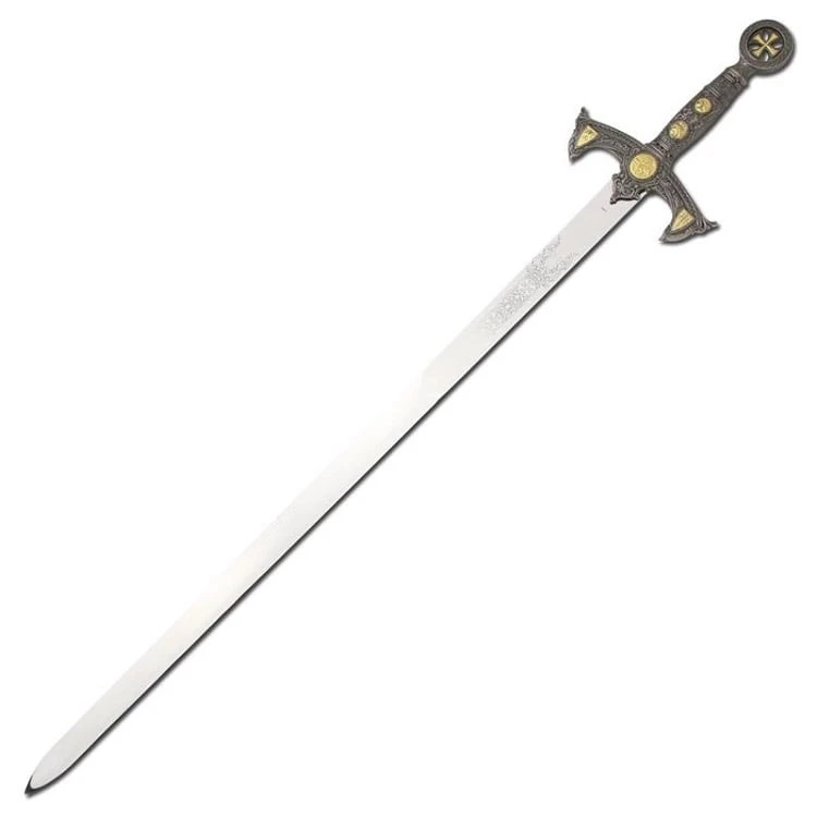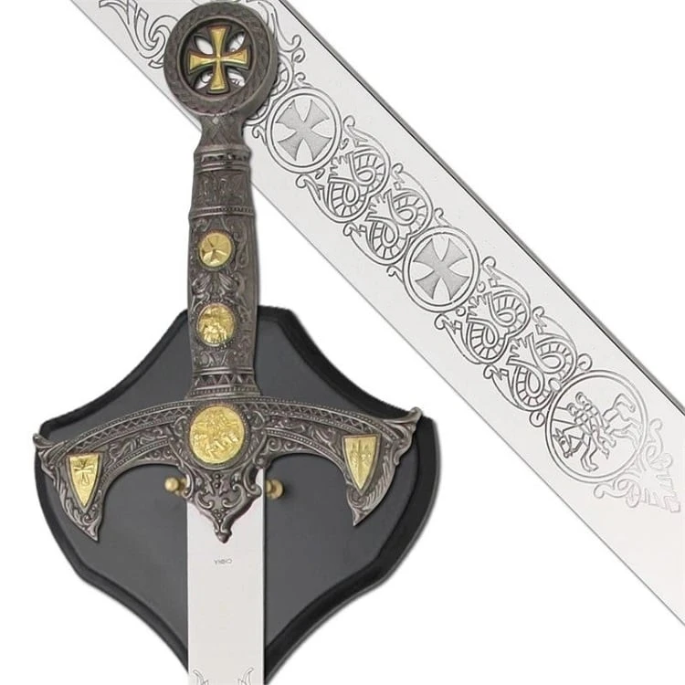Intricately detailed, the hilt of his sword is set in steel with the central designs highlighted by a polished gold. The pommel is set with an ornate cross with four ovals cut out around it, while the handle is a mass of molded patterns, set with two gold medallions depicting symbols significant to the Knights Templar. The guard bears the same mass of molded patterns, framing the three gold sections that are the guards central features. The center medallion is the Seal of the Knights Templar, two knights mounted on one horse. Etched into the polished stainless steel blade are a series of artistic patterns, framing two Templar crosses and the Seal of the Knights Templar at the bottom of the design, which stretches roughly a third of the way down the blade.
