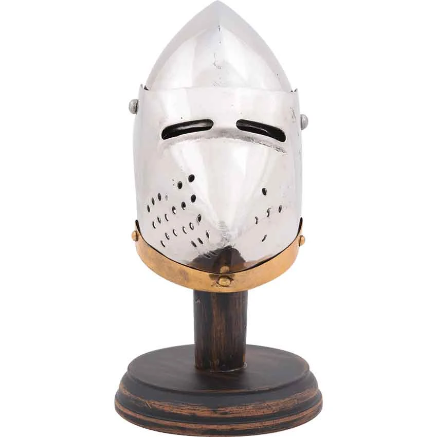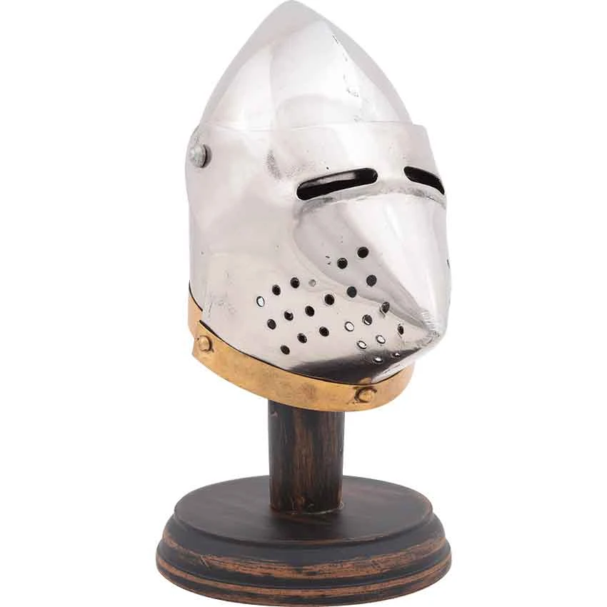 The Miniature Pig Face Bascinet Helmet brings style in a small package. Made from 20 gauge mild steel, this mini helmet has a traditional bascinet helmet shape. It features the typical pointed face plate. The face plate has holes where ventilation spots would be on a full sized helm. There are two eye slots above the ventilation holes. Also, this face plate slightly articulates so that it raises up like a regular bascinet would. Next, the steel helmet has a polished finish and a brass colored bottom rim. This tiny helmet looks great on a shelf or desk.
