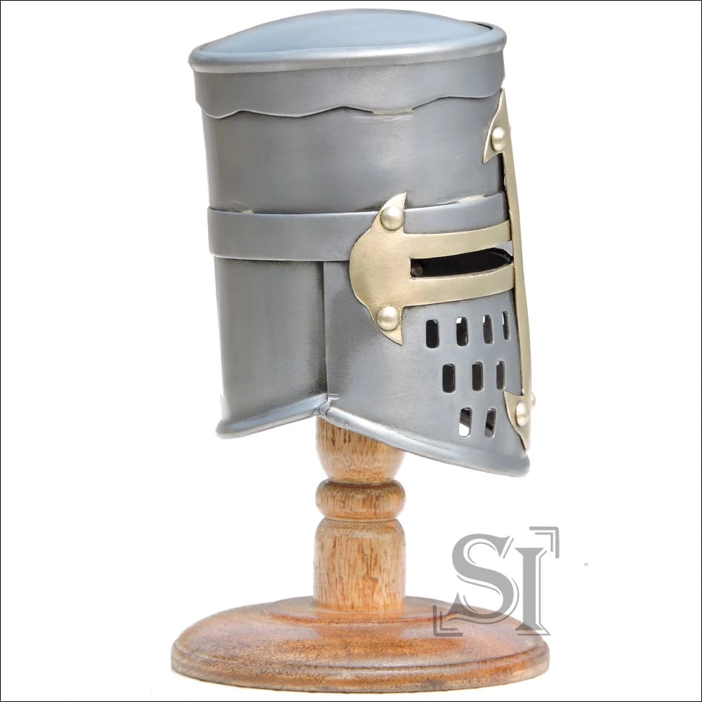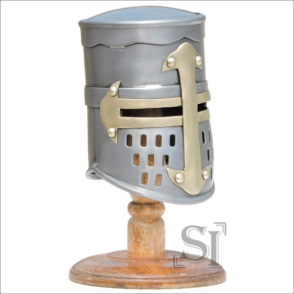 Bring easy medieval flair to your home or office decor with the Mini Crusader Great Helm. This mini knight helmet has a traditional great helm shape with a rounded top, and its face is accented with a brass cross.
