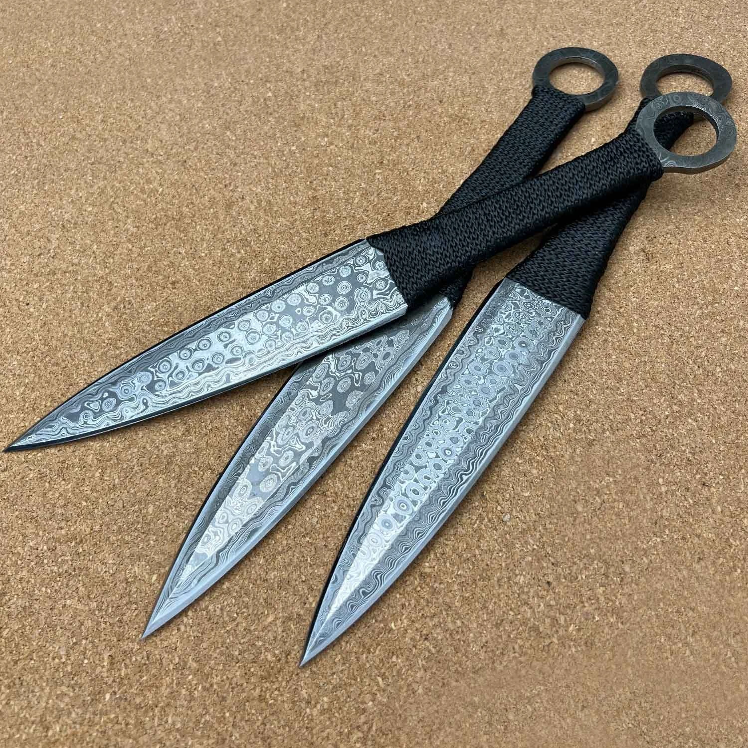 12 Inch overall, Pack of 3 Damascus Throwing Kunai Knife, Sharp Throwers. Damascus throwing knife, Naruto kunai knife, Damascus drop point throwing knife, Hand Made Knives. 352 Layer (1095/15N20) Steel Blade Oil Tempered to 58-60 HRC