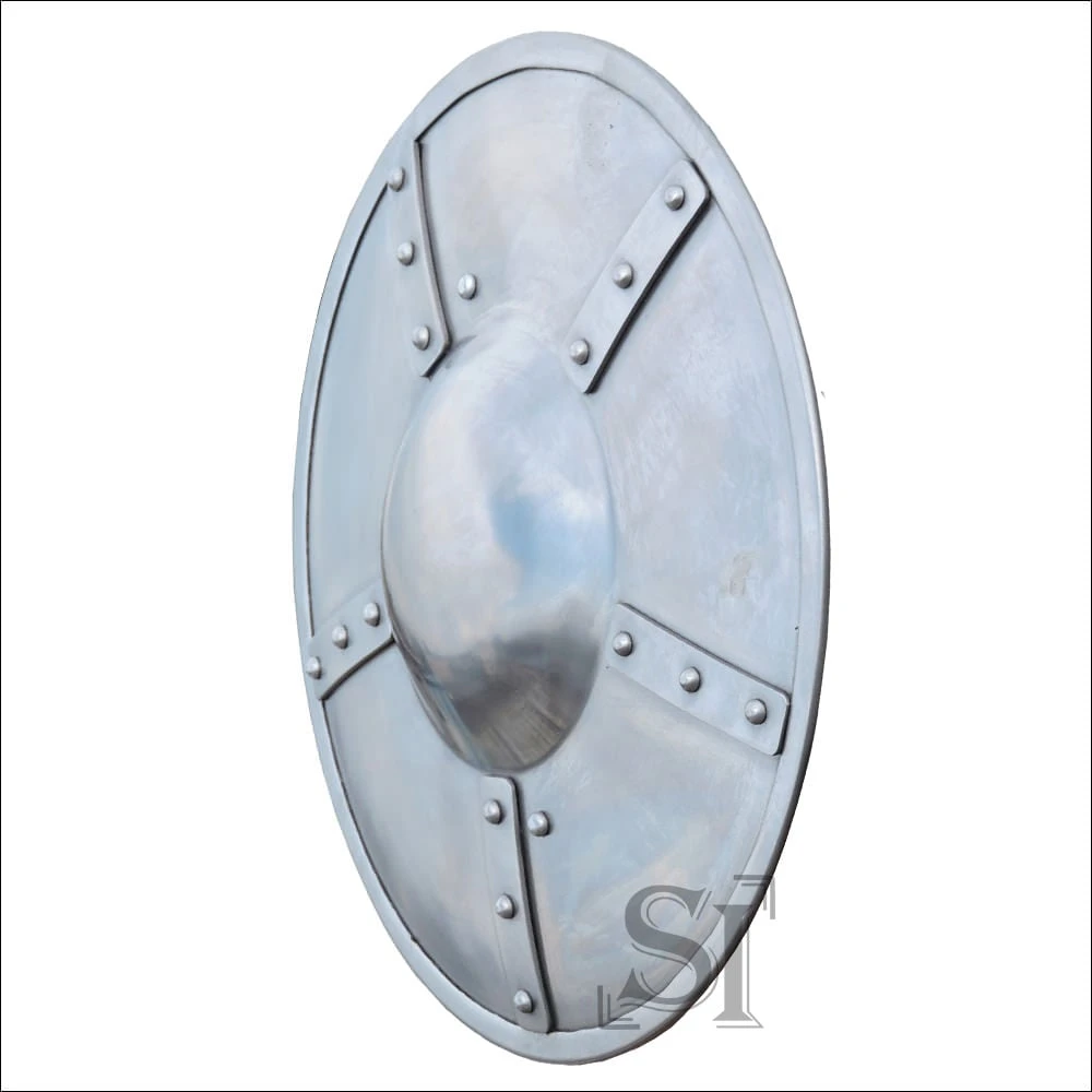 This Polished Medieval Buckler Shield has an approximate diameter of 12 inches. The handle is made from forged iron and riveted down with wood.