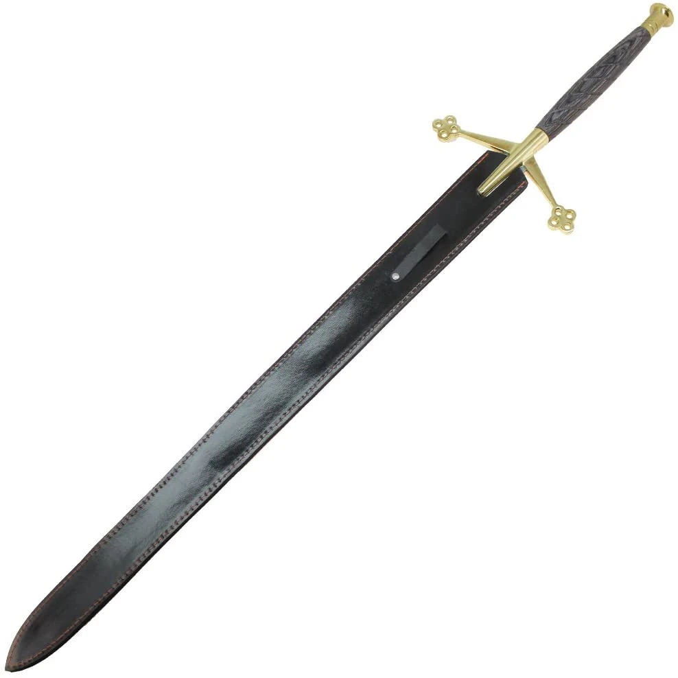 Extra long for more power from this huge stainless steel Claymore longsword with 10.75 inch long handle. The blade is semi-functional and slightly sharp, plus has a very refined mirror polish. The guard is a classic European style swept forward and with Celtic clover leaf decorations. The handle is hand carved hardwood with a dark stain and has a very solid, firm grip. The pommel and hand guard are both solid metal with a golden finish. Comes with a free leather sheath.