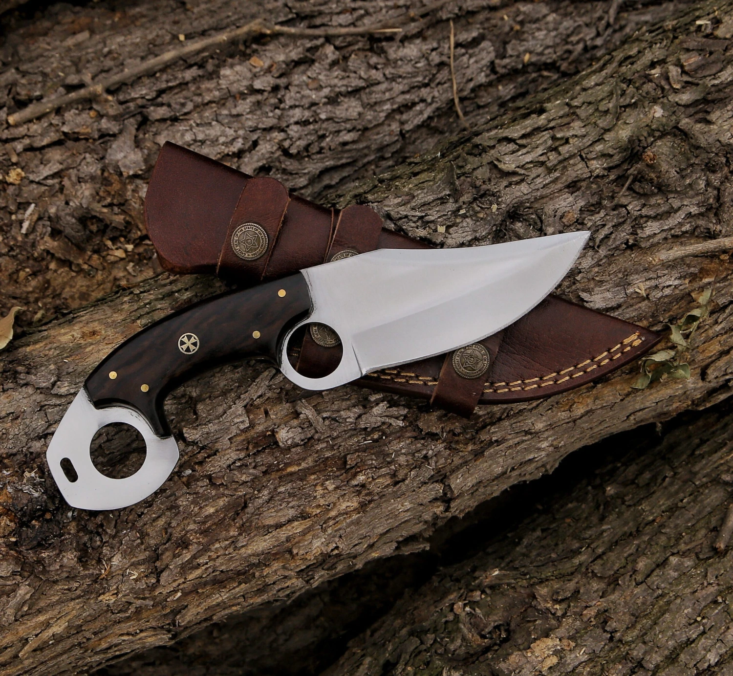 This beautiful everyday carry combat fixed blade knife feels great in your hand and is suitable for Outdoor Survival, Camping, and any cutting task. Great multipurpose tool for indoors or outdoors. Our high-end steel custom handmade well-balanced hunting knife is hand-forged. A genuine leather sheath is included. It has been hand sewn and stained. This sheath has belt loop so you can take this knife along when you are on the go!