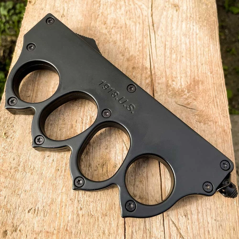 The trench knuckle OTF is one of the toughest knives we carry. It is a double action OTF knife with 440 dual tone stainless steel blade. The black knuckle handle is steel frame that includes a pocket clip and glass breaker stub. The glass breaker is a great tool to have for emergency situation where a window may need to be broken. The side of the handle features a slide that you push up to deploy the blade and in the same motion pull back to retract.